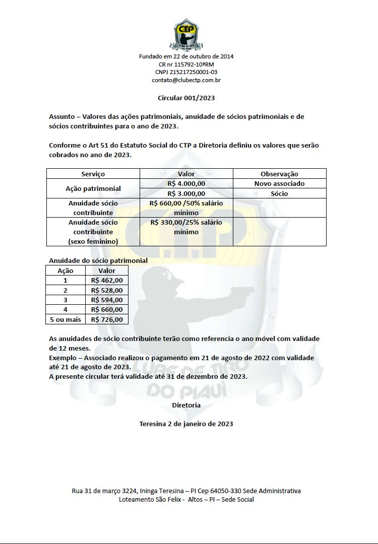 Conforme previsto no estatuto social do clube a diretoria torna publico os valores das anuidades para o ano de 2023.